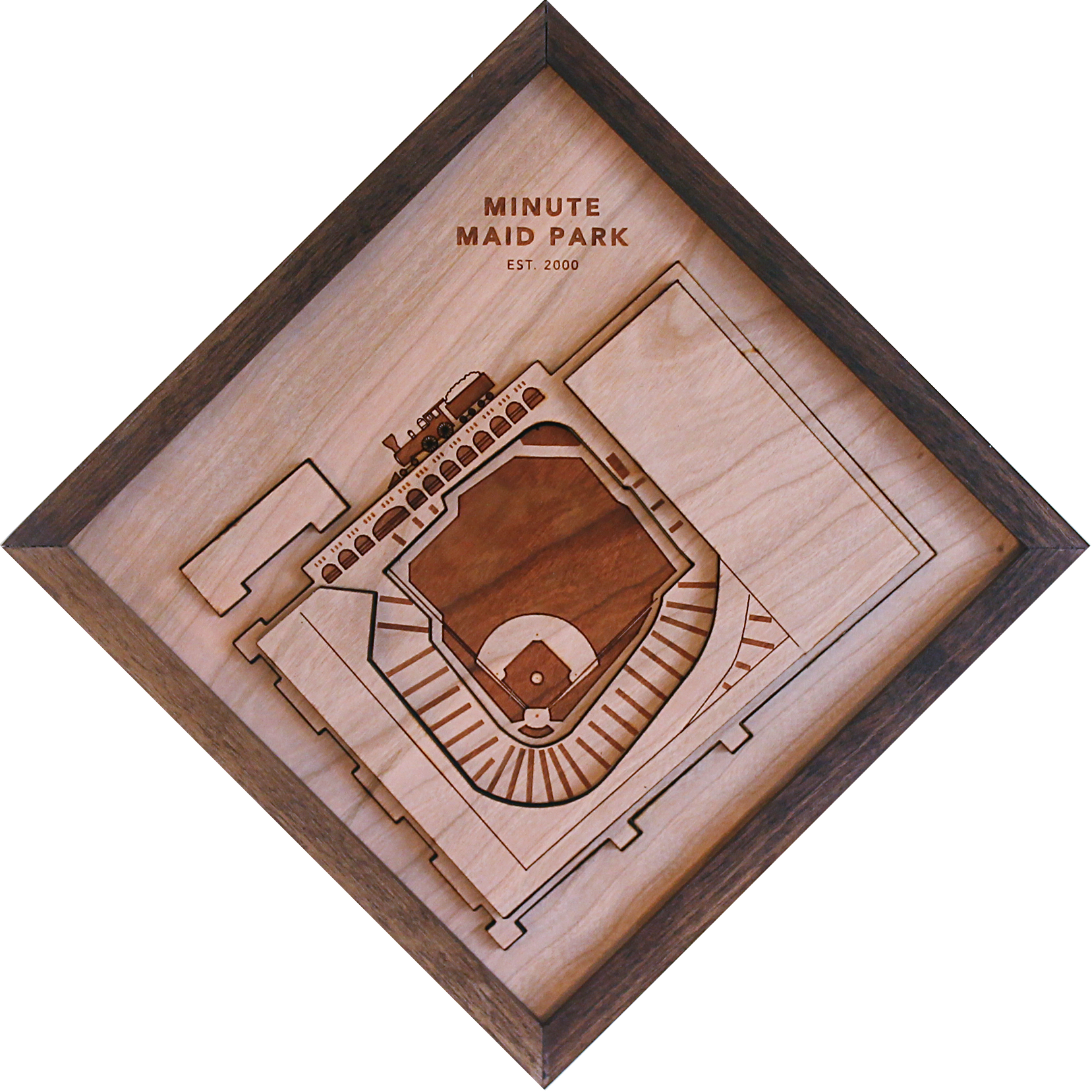Each piece is laser cut from from a single grain of solid cherry into 3 tiers. The black walnut frame and stadium are then hand assembled and arrive ready to hang.